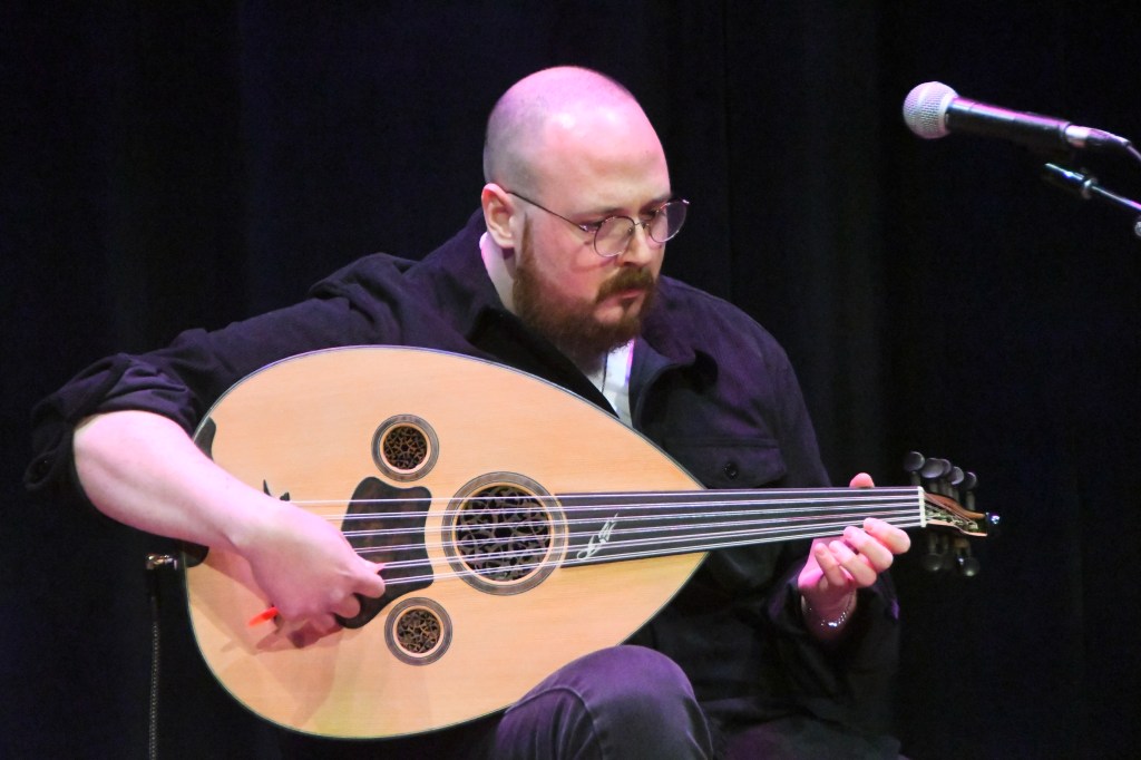 Wielding a stick-like pick, Kaye relied on the oud’s deep double-stringed resonance in early-song melodic statements, then spun out in widening patterns, jazz-like, as he sped up his phrasing, like Jerry Garcia speed strums.