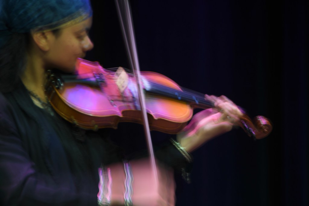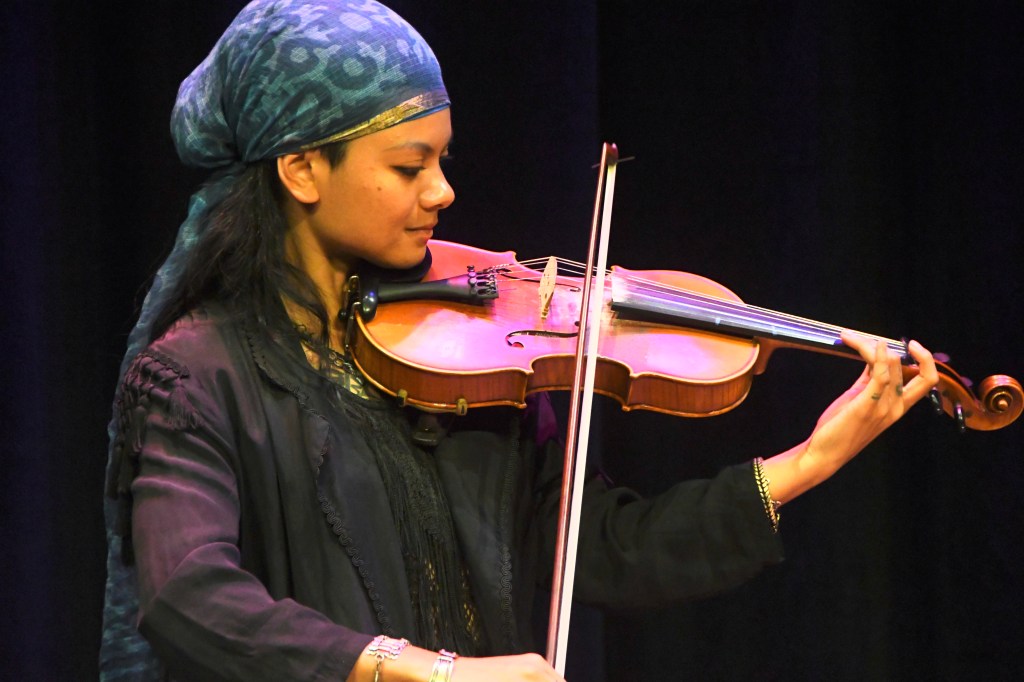 Tiny, the scarf around her head stretching to near her ankles all of five feet below, Castro played powerhouse, punchy passages or, as in “I’ll Figure It Out,” lyrical, relaxed musings. At times, she echoed European jazz violinists Jean-Luc Ponty or Michal Urbaniak; just as Kaye (more distantly) evoked Django Reinhardt occasionally.