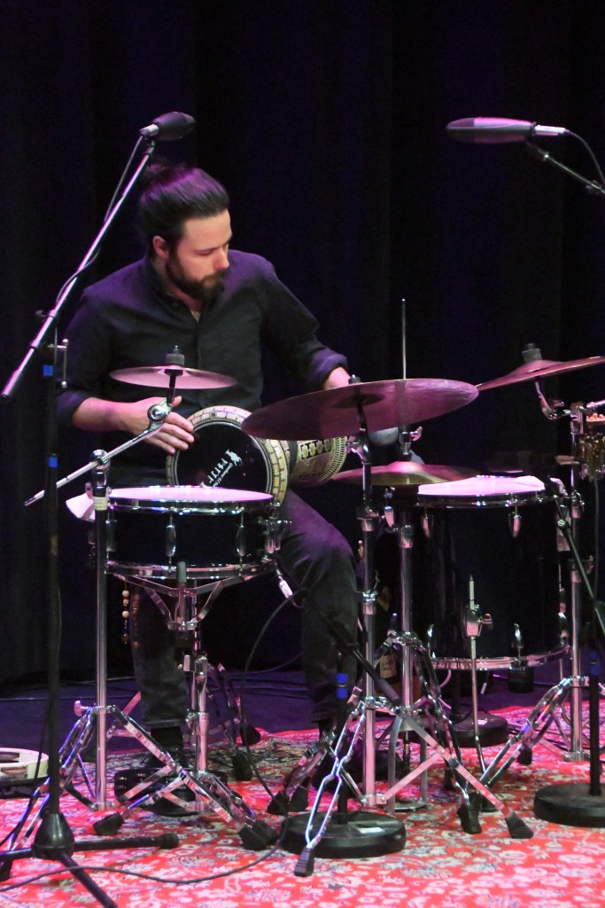 “Kosher Bacon” introduced their episodic groove-with-solos performing style, Castro bowing long-line melody over Kaye’s staccato oud chops to fit, then pushing and pulling the beat in his own solo. The faster, dance-y “Davka” felt even more rhythmic, speeding and slowing to a hard stop. The new “White Sauce Hot Sauce” honored a Brooklyn halal food truck – Kaye told us where to find it – a delicious menu of melody and busy beats that alternated clear speedy runs with trance-y drones.