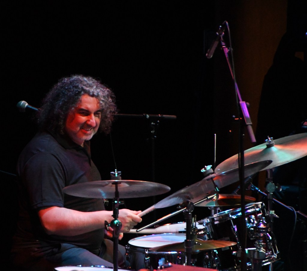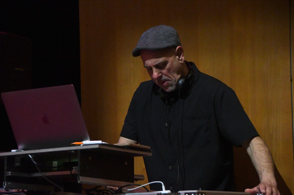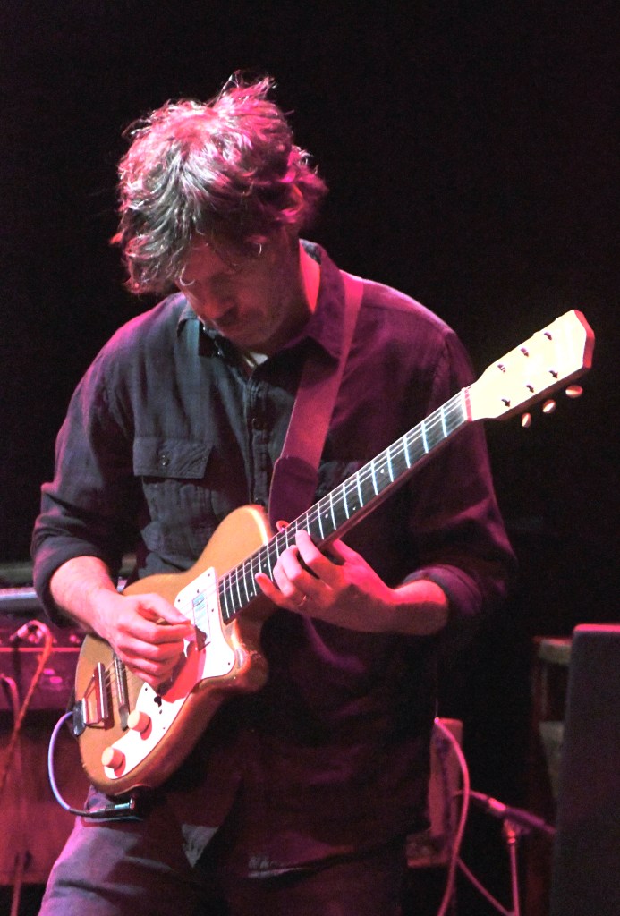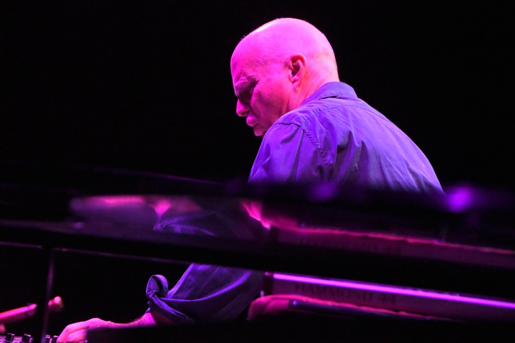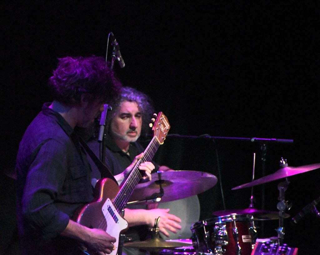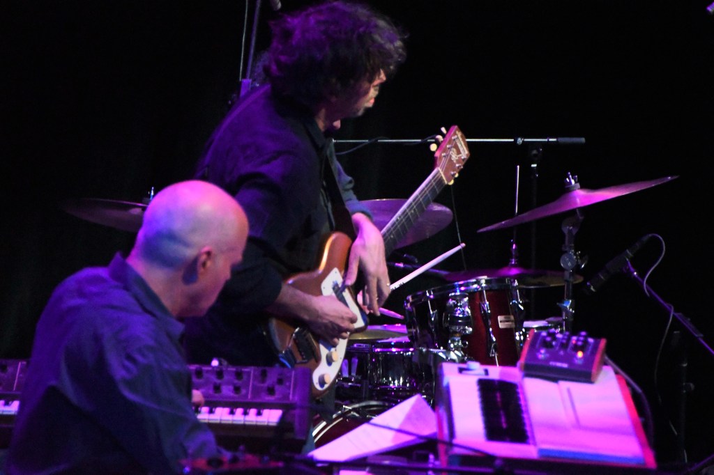 The flow-in music turntablist Mister Rourke had played as fans filed in gradually picked up passengers as the other players joined. Rivard lay down repeating bass lines on a rectangular fretless Moroccan sintir, simple and strong. His right hand hit its gut strings downward at times, like a (pre-Scruggs) frailing banjoist. When he switched to electric bass guitar later, he mostly plucked upwards, conventionally, but kept his distinctive, quietly urgent flavor. Drummer Fabio Pirozzolo kept that same pulse, but decorated it. Metzger’s guitar formed a bridge between bass and drums below and Medeski’s (eight!) keyboards in solos as wild as Rourke’s turntables up top.