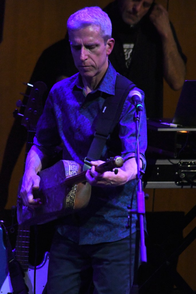 Mike Rivard plays sintir, above; and electric bass guitar, below