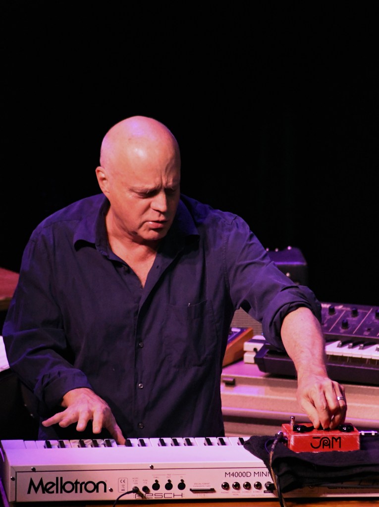 John Medeski plays Mellotron, above; synthesizer as seen through the lid of his grand piano, below; then piano below that
